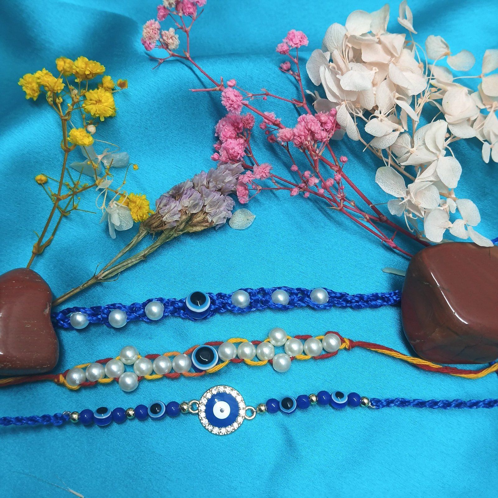 Designer Rakhi Set of 3 for Brother with Roli Chawal set | Evil Eye & Pearl Rakhis with Red, Blue Thread | Stylish Handmade Rakhi Combo