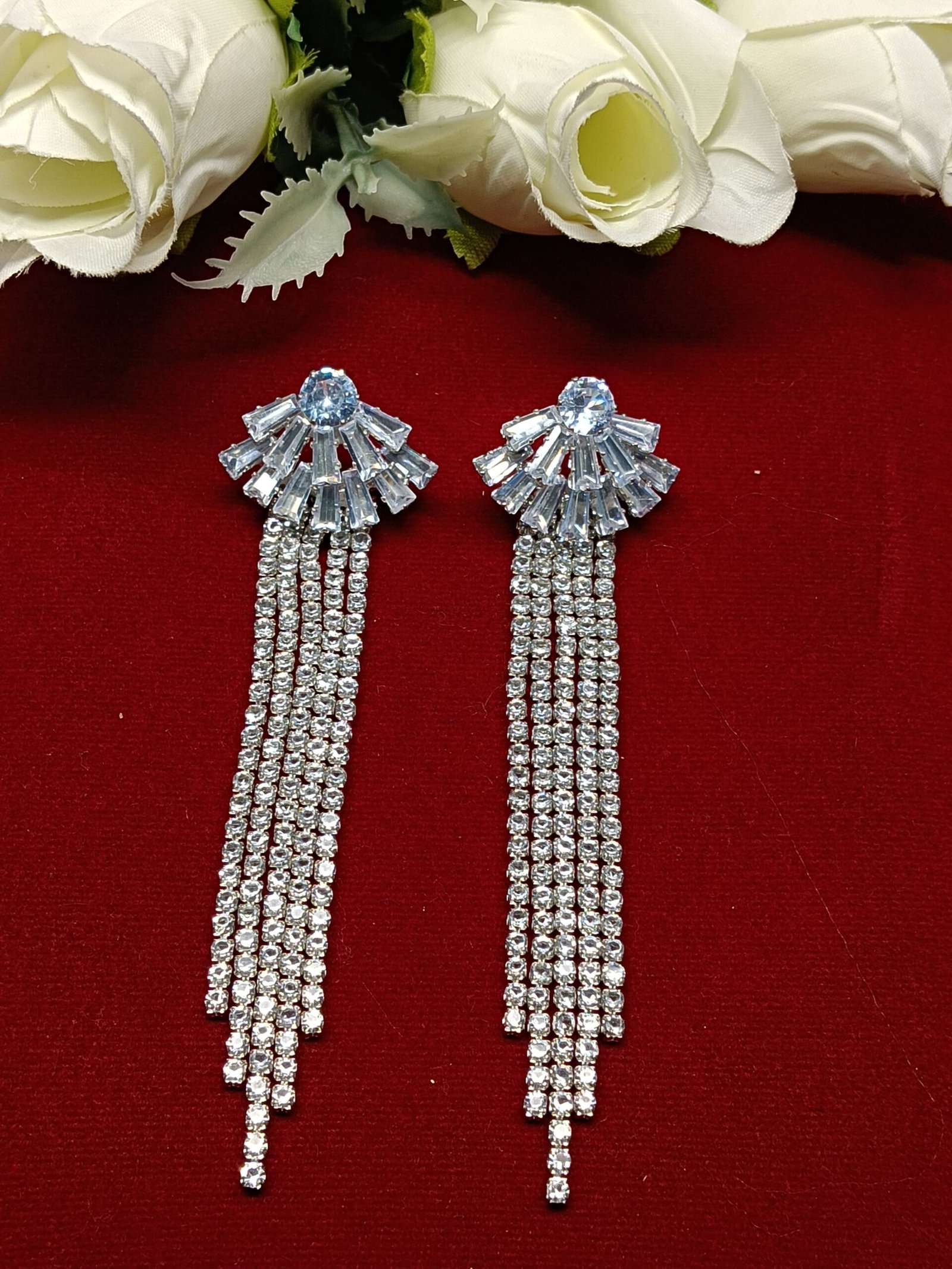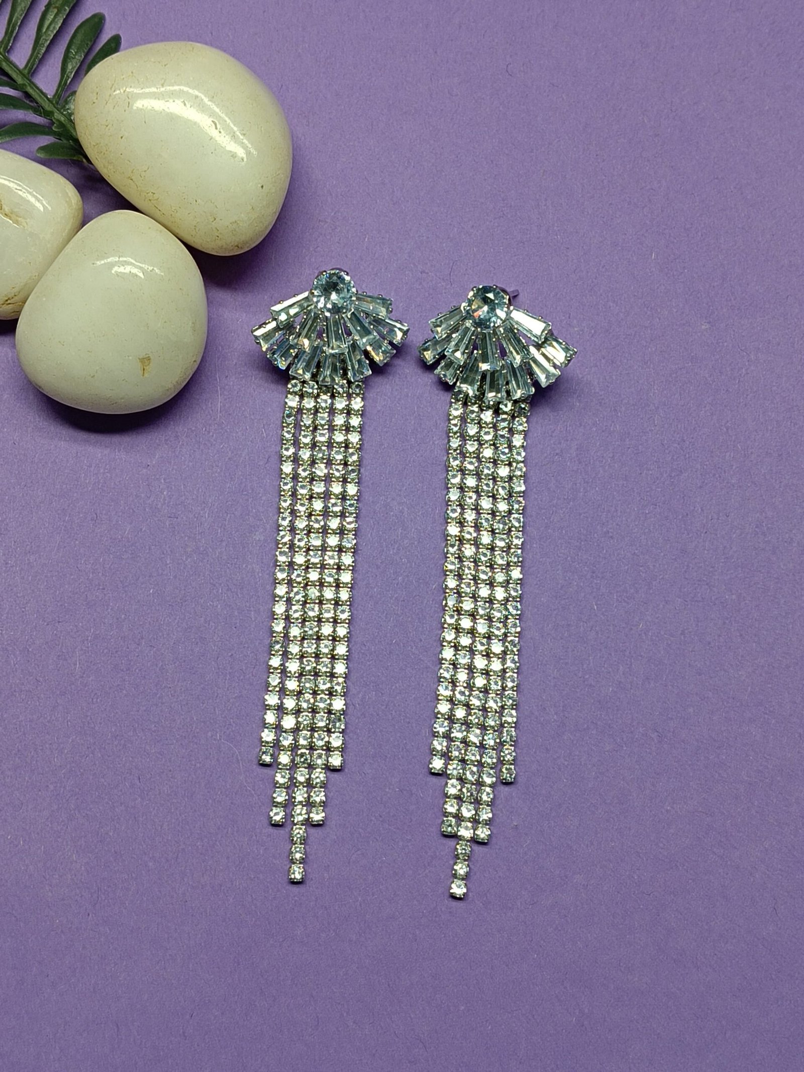 - PRODUCT DETAILS: Step into the spotlight with these stunning silver-tone rhinestone tassel earrings—crafted to add sparkle and sophistication to any special occasion. Each earring begins with a sleek, tiered geometric top, anchored by a radiant clear rhinestone stud. From there, delicate strands of shimmering rhinestones flow downward in a graceful tassel, catching the light with every movement. Whether you’re heading to a party, a wedding, or a festive celebration, these lightweight earrings bring the perfect mix of elegance and drama to your look—all in a versatile silver finish that pairs effortlessly with your wardrobe.