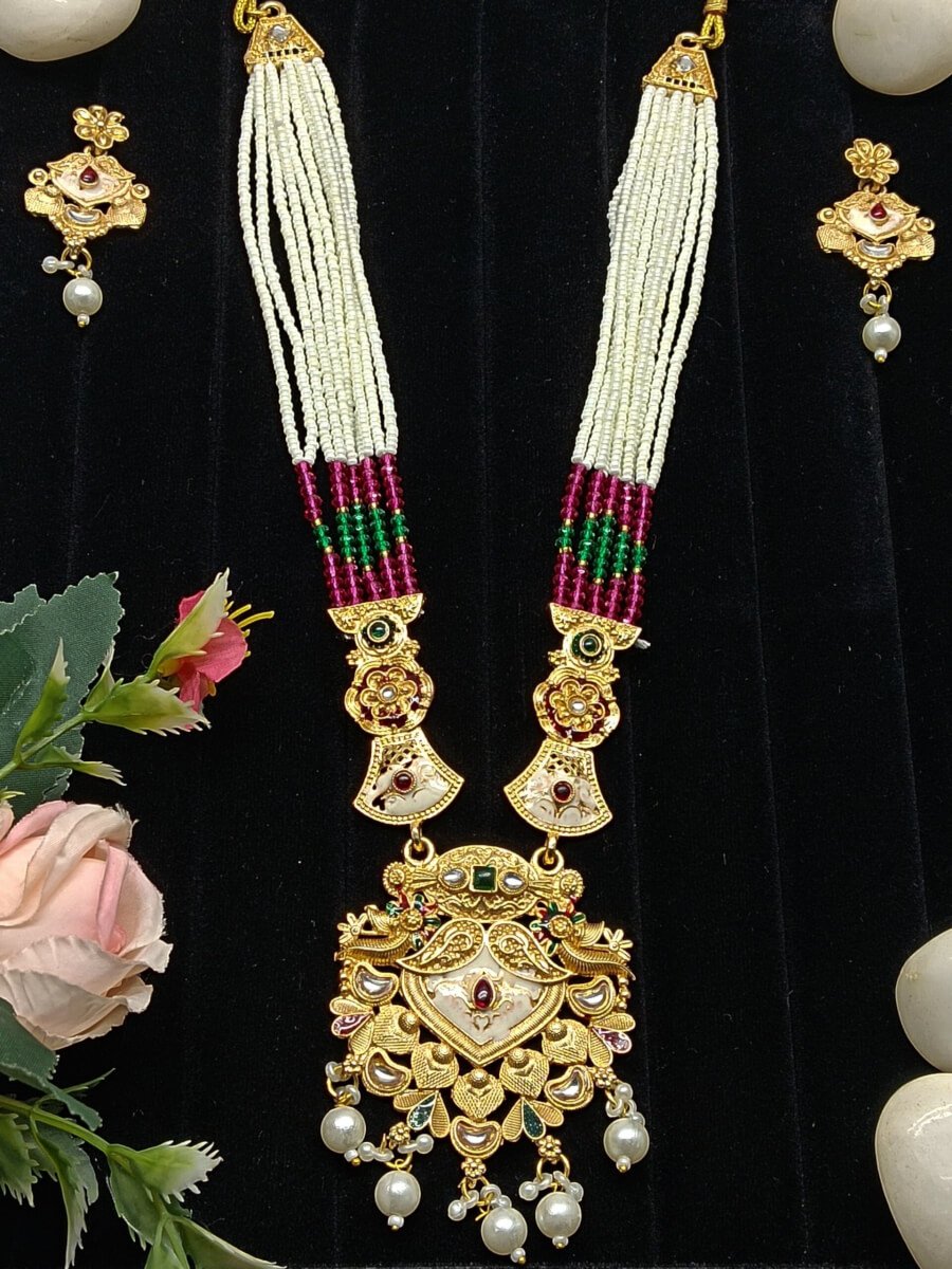 - PRODUCT DETAILS : Celebrate timeless beauty with this exquisite traditional Indian jewelry set, crafted to elevate your ethnic style for weddings, festivals, and other special occasions. The set includes a long, multi-strand necklace strung with white pearls and adorned with colorful accents for a refined pop of color. At the heart of the necklace is a gold-plated ornate pendant, designed with intricate detailing that reflects the essence of Indian craftsmanship. The matching earrings echo the pendant’s design, creating a cohesive and regal ensemble. Lightweight and comfortable, this set is ideal for long events while still making a bold statement. A thoughtful and elegant gift for women who appreciate classic Indian jewelry, this set perfectly blends luxury, tradition, and sophistication.