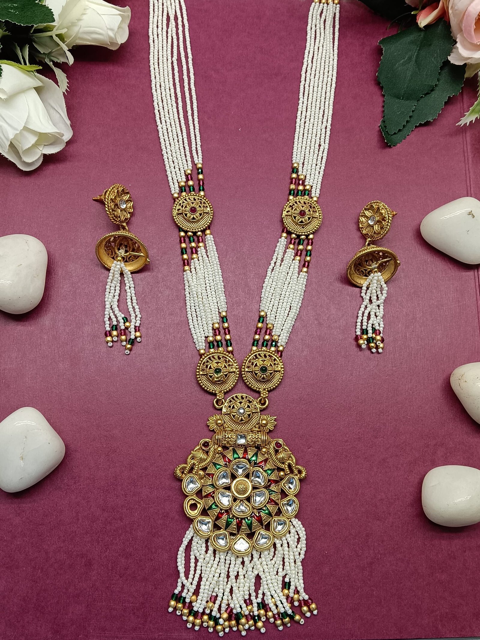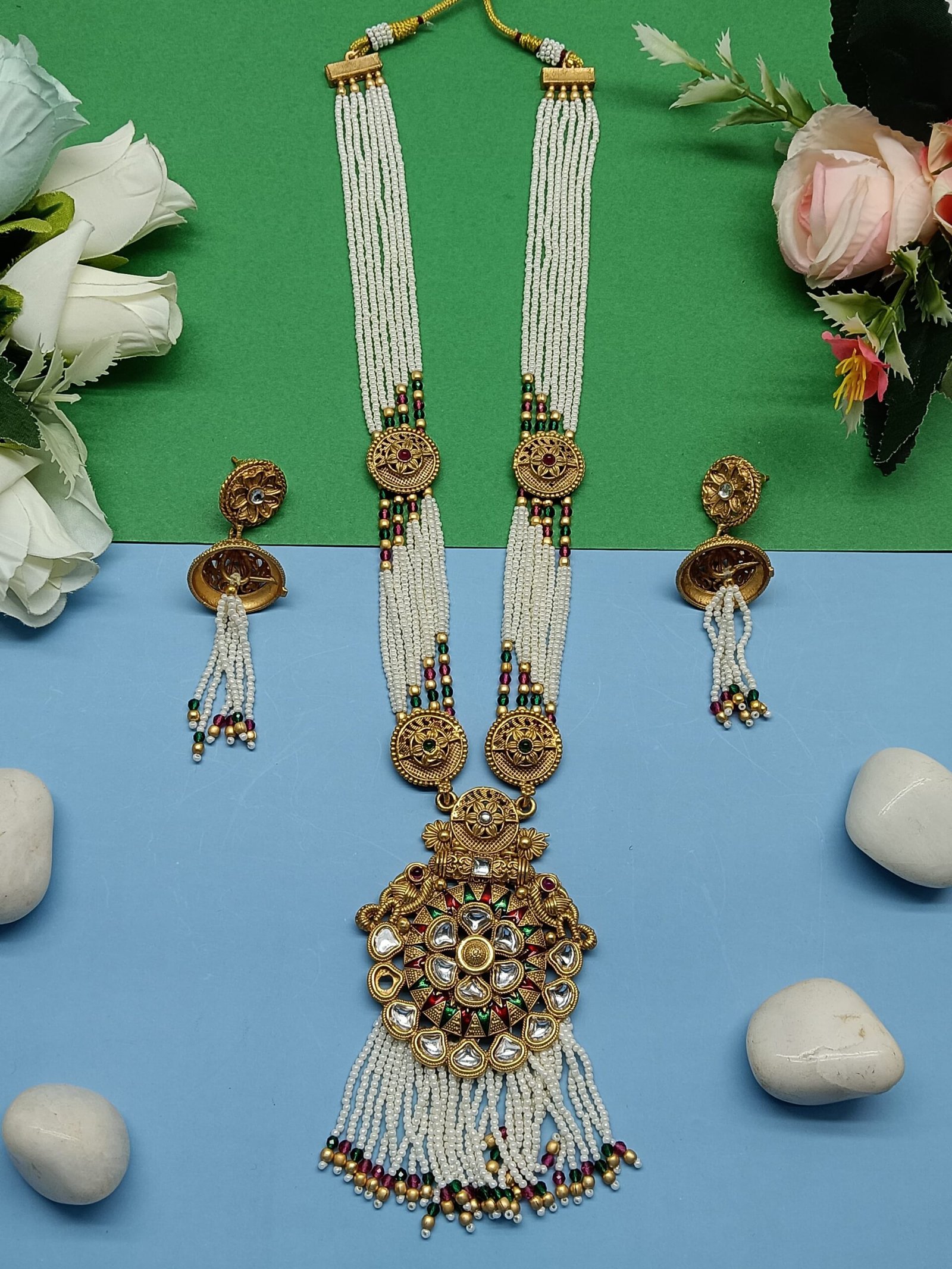 - PRODUCT DETAILS: Elevate your ethnic ensemble with this traditional Indian necklace set, designed for elegance and grandeur. The set features a long, multi-strand necklace crafted with rows of small white beads, delicately interwoven with gold-toned decorative elements that bring a timeless charm. A large, intricately designed pendant serves as the centerpiece, adding a bold and regal touch to the piece. Paired with matching earrings that echo the intricate gold-toned work and bead detailing of the necklace, this set is ideal for weddings, festivals, and other special occasions. It’s a striking addition to any traditional jewelry collection, designed to complement sarees, lehengas, and other festive attire.