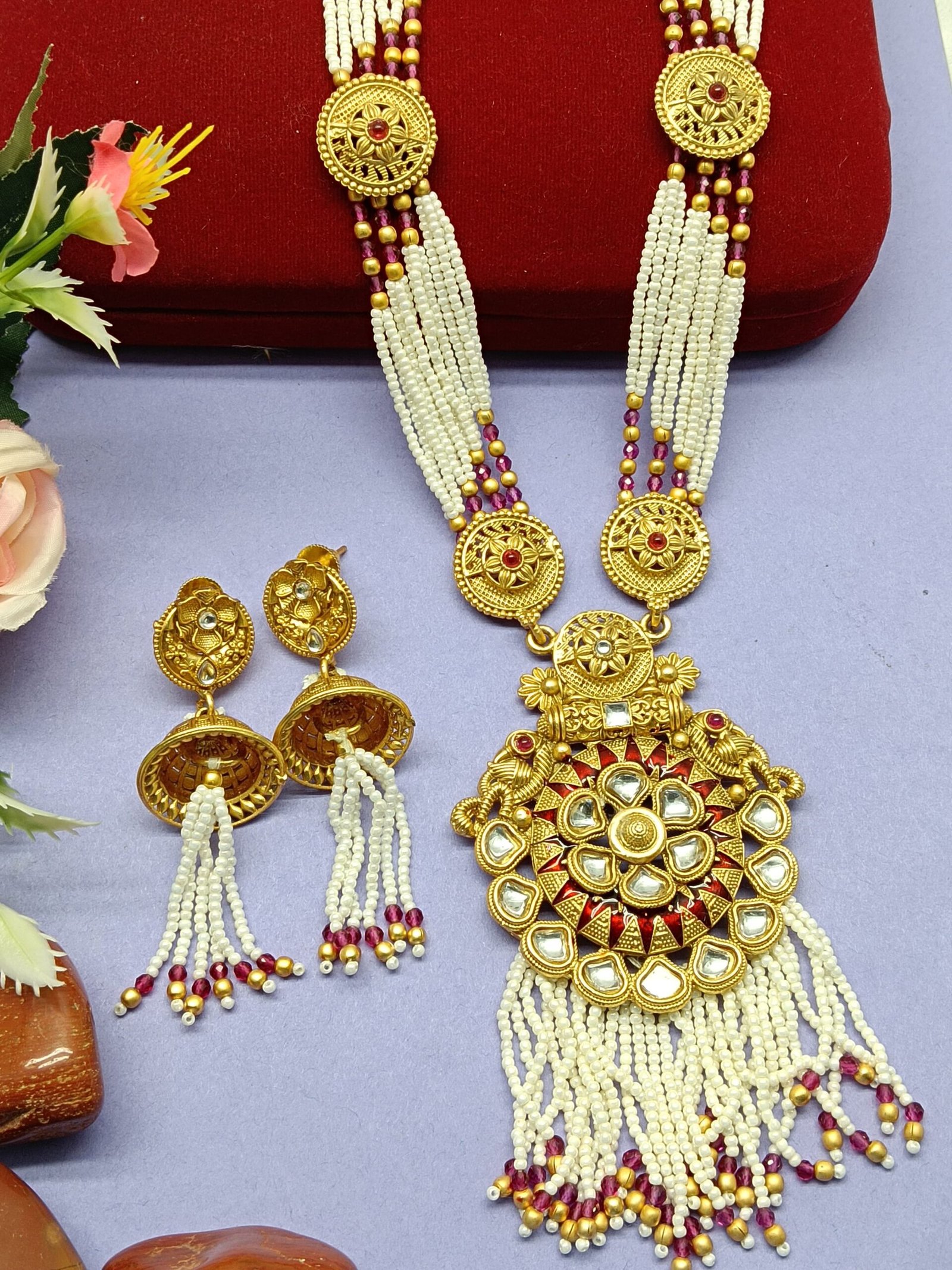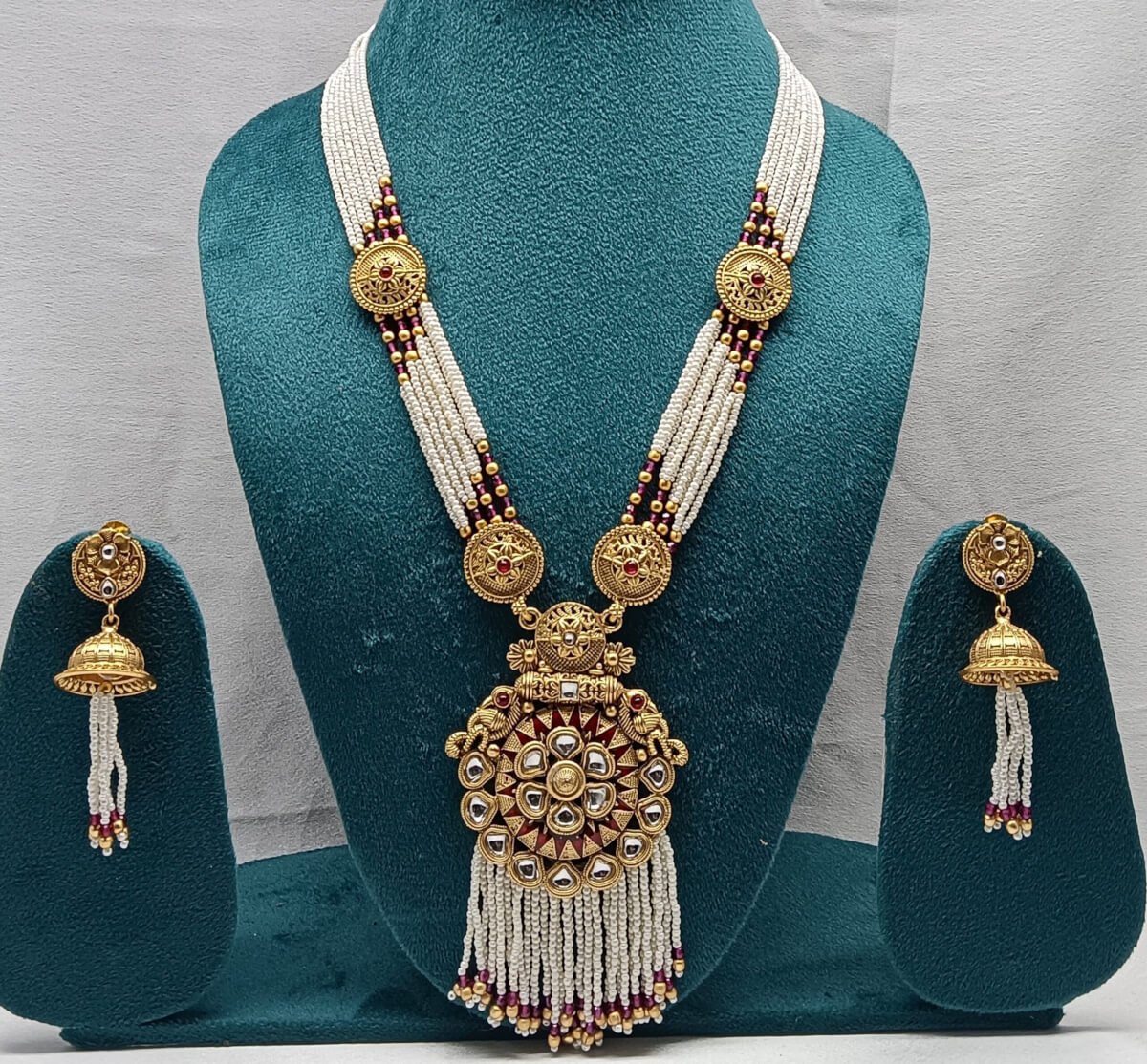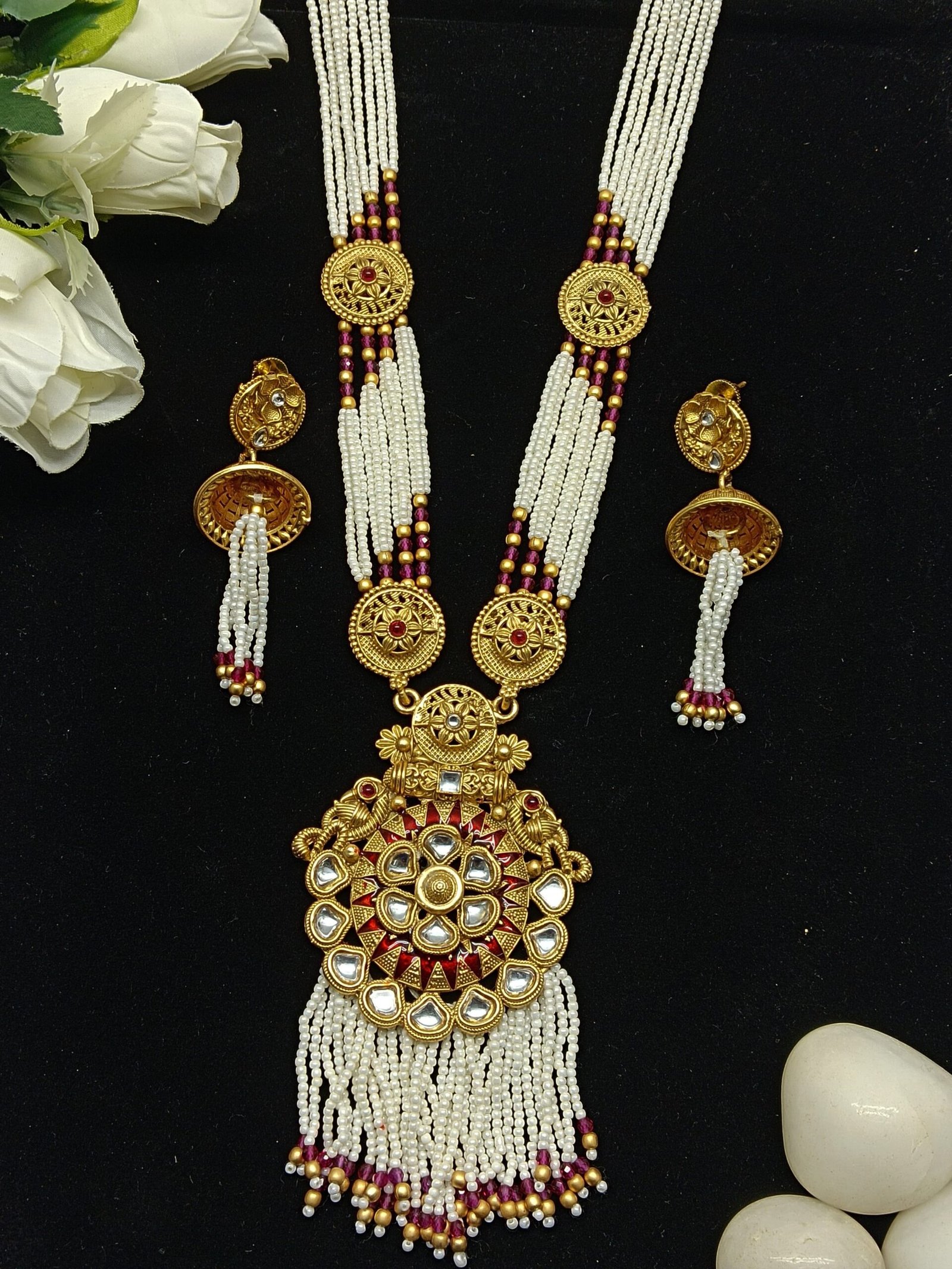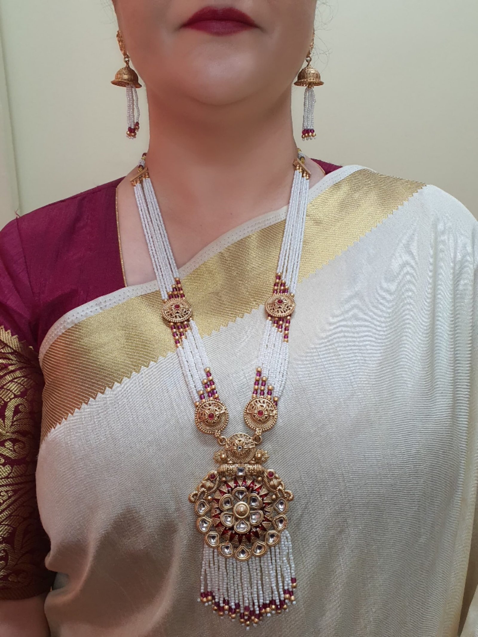 - PRODUCT DETAILS: Add timeless elegance to your collection with this beautifully crafted multi-strand pearl necklace set, designed to complement traditional and festive attire. The necklace features rows of lustrous white pearls accented with rich maroon and gold-toned elements, bringing depth and vibrance to the design. At the center is a prominent circular pendant, intricately detailed and adorned with pearl embellishments, creating a striking focal point. The matching earrings echo the pendant’s circular motif and feature pearl tassels for added grace and harmony. Crafted to highlight the natural luster of pearls, this set exudes sophistication and traditional charm, making it ideal for weddings, festive gatherings, or formal events.