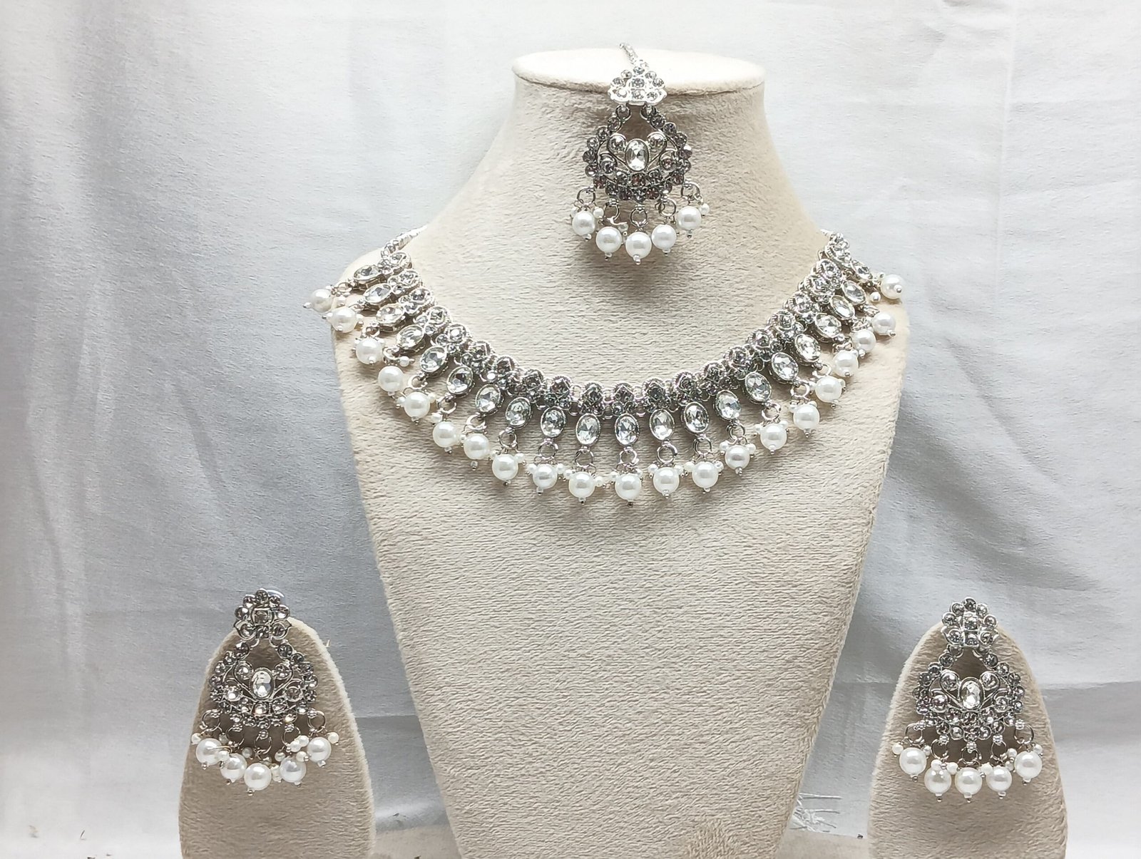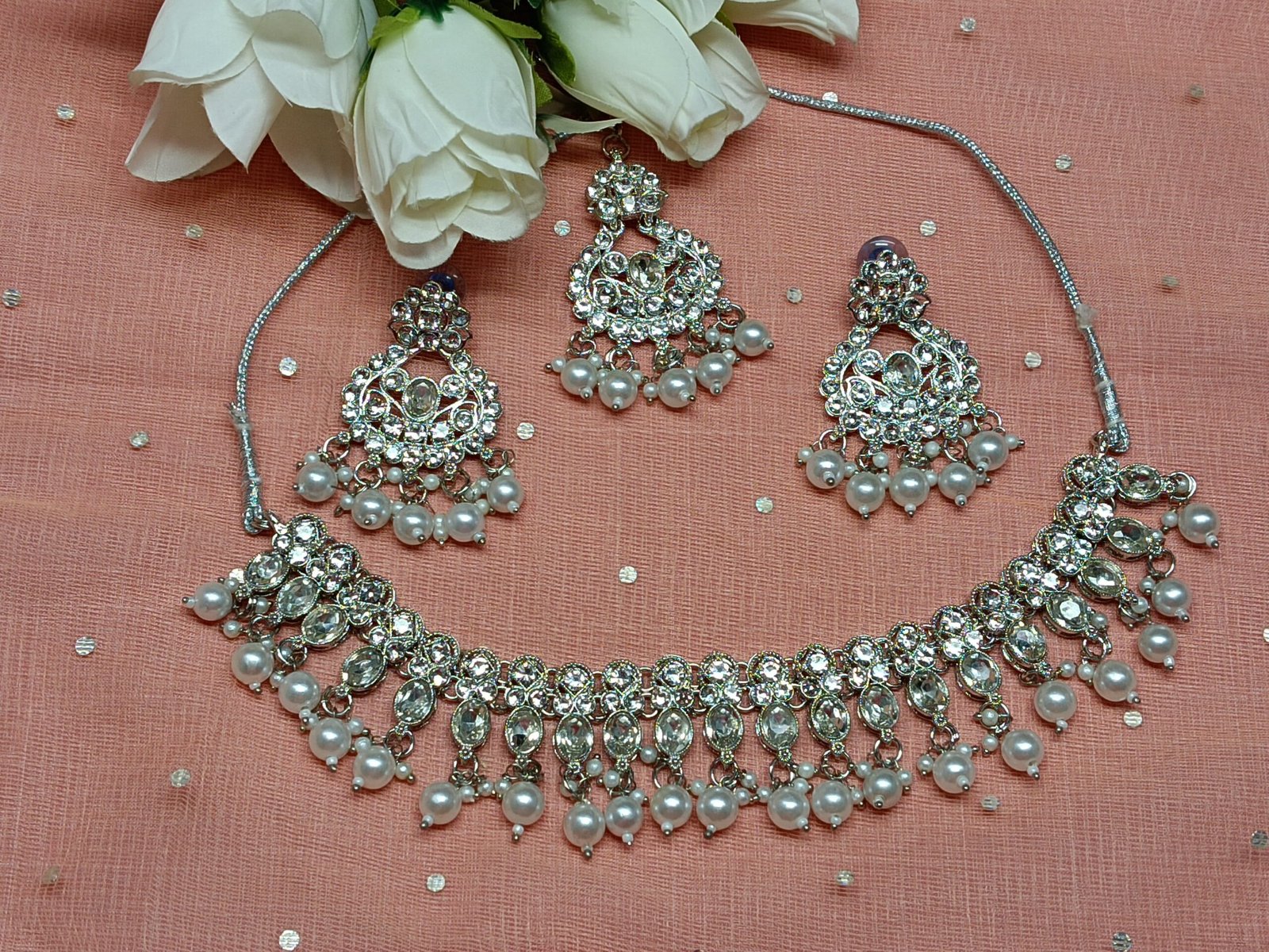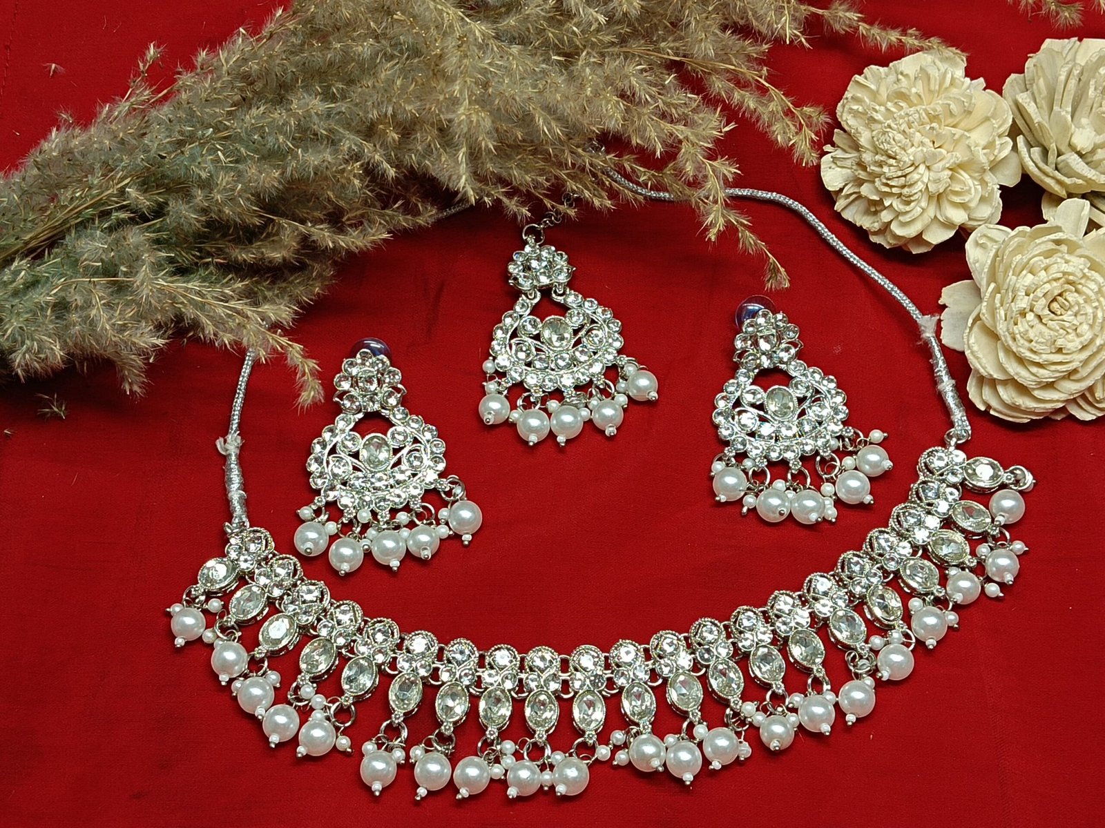 - PRODUCT DETAILS: This jewelry set features a traditional design with intricate detailing, suitable for pairing with ethnic outfits. The craftsmanship includes delicate patterns and shimmering accents, offering a refined appearance without being overly ornate. Made from a polished metal with a silver-tone finish and sparkling decorative elements, such as stones or beads. Exact material composition may vary.