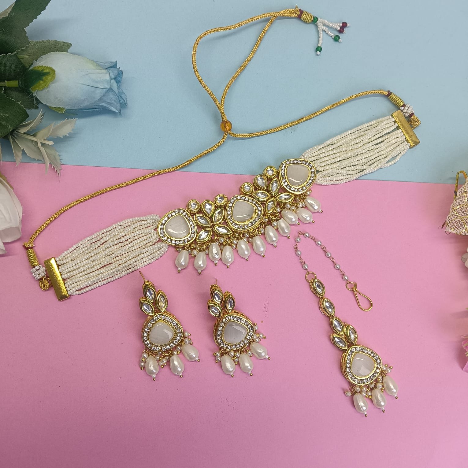 Traditional Gold-Tone Pearl Choker Necklace set for Women| Indian Ethnic Jewelry