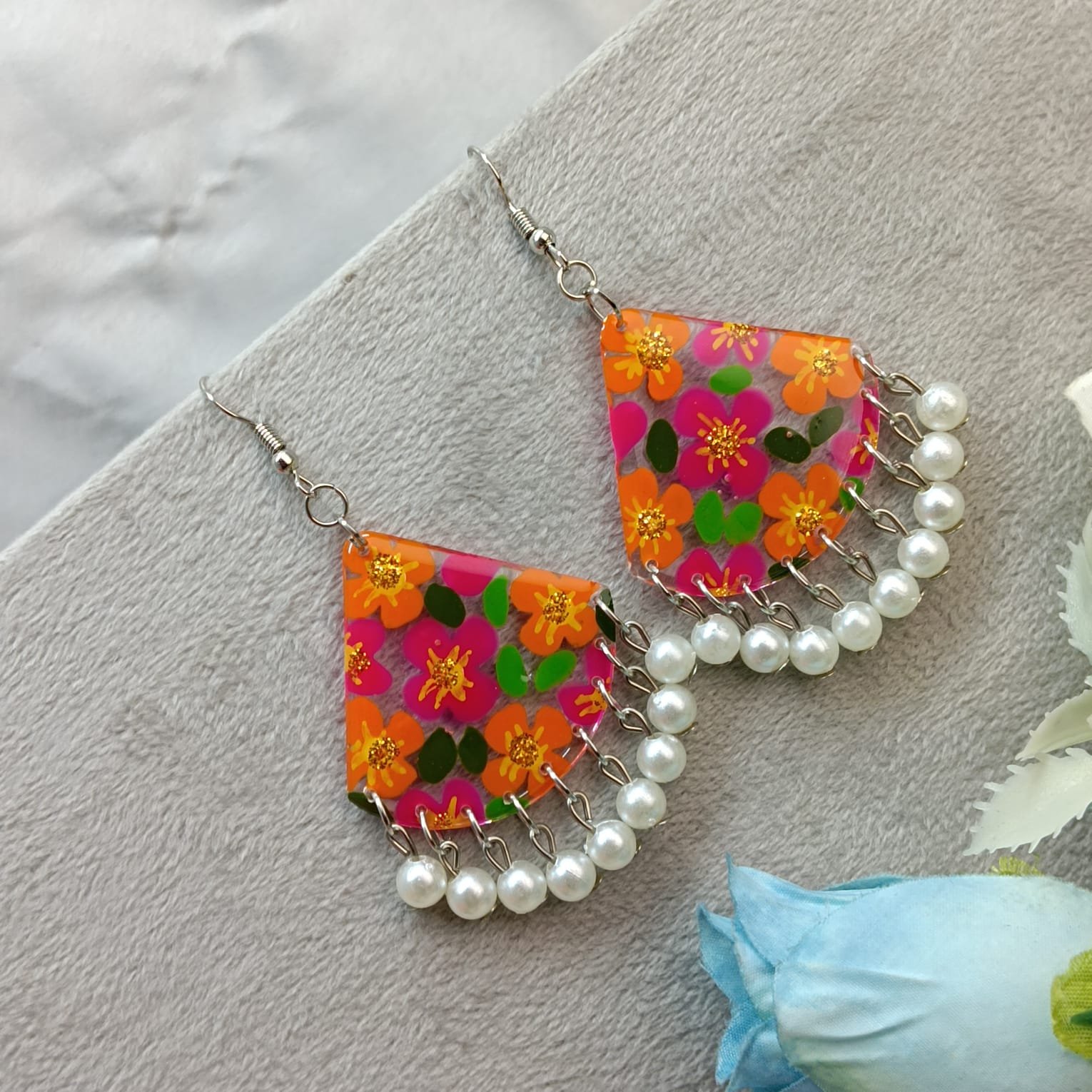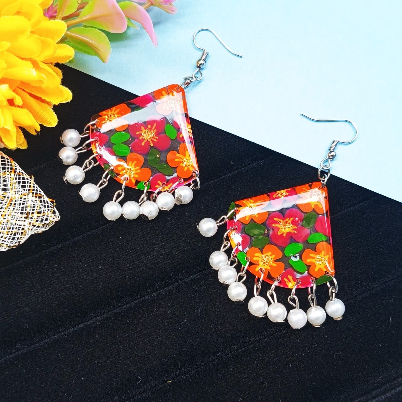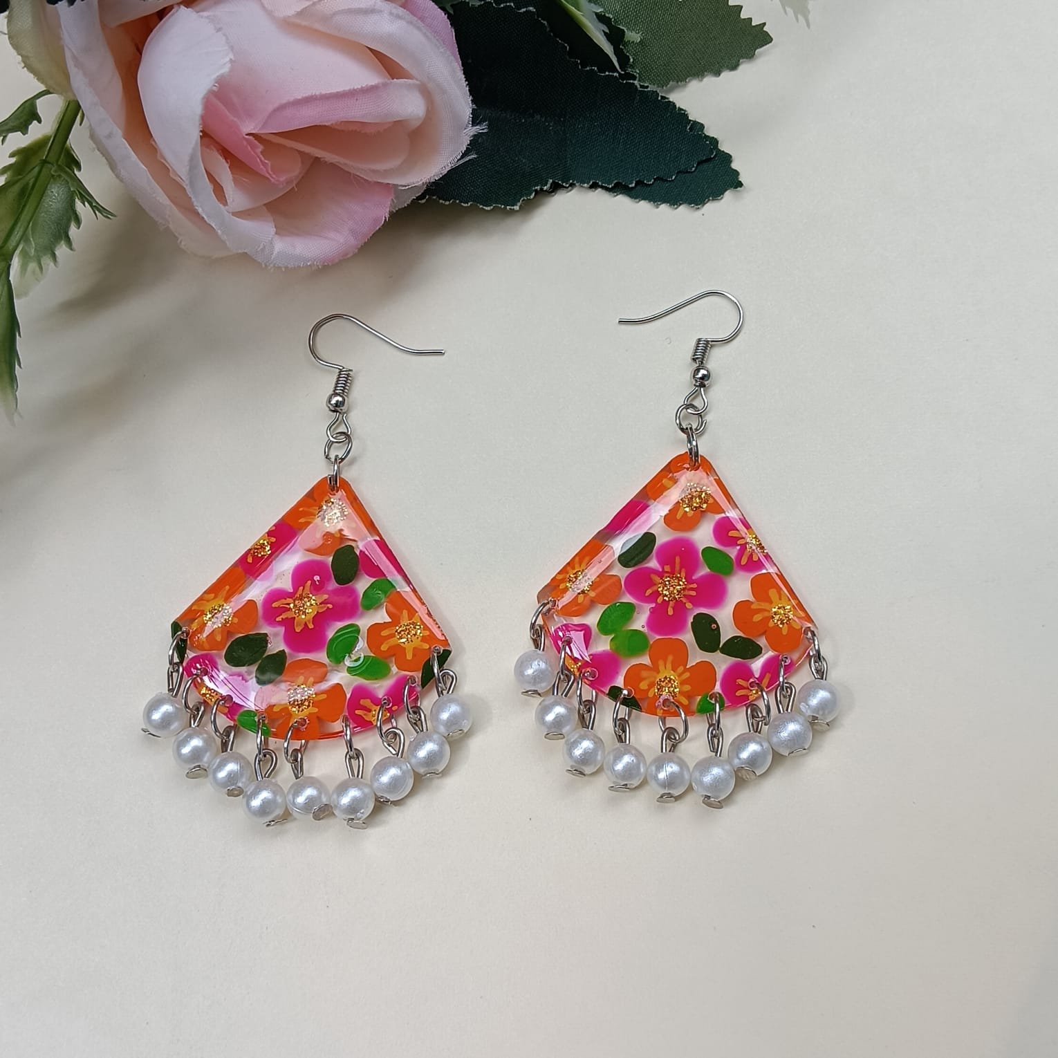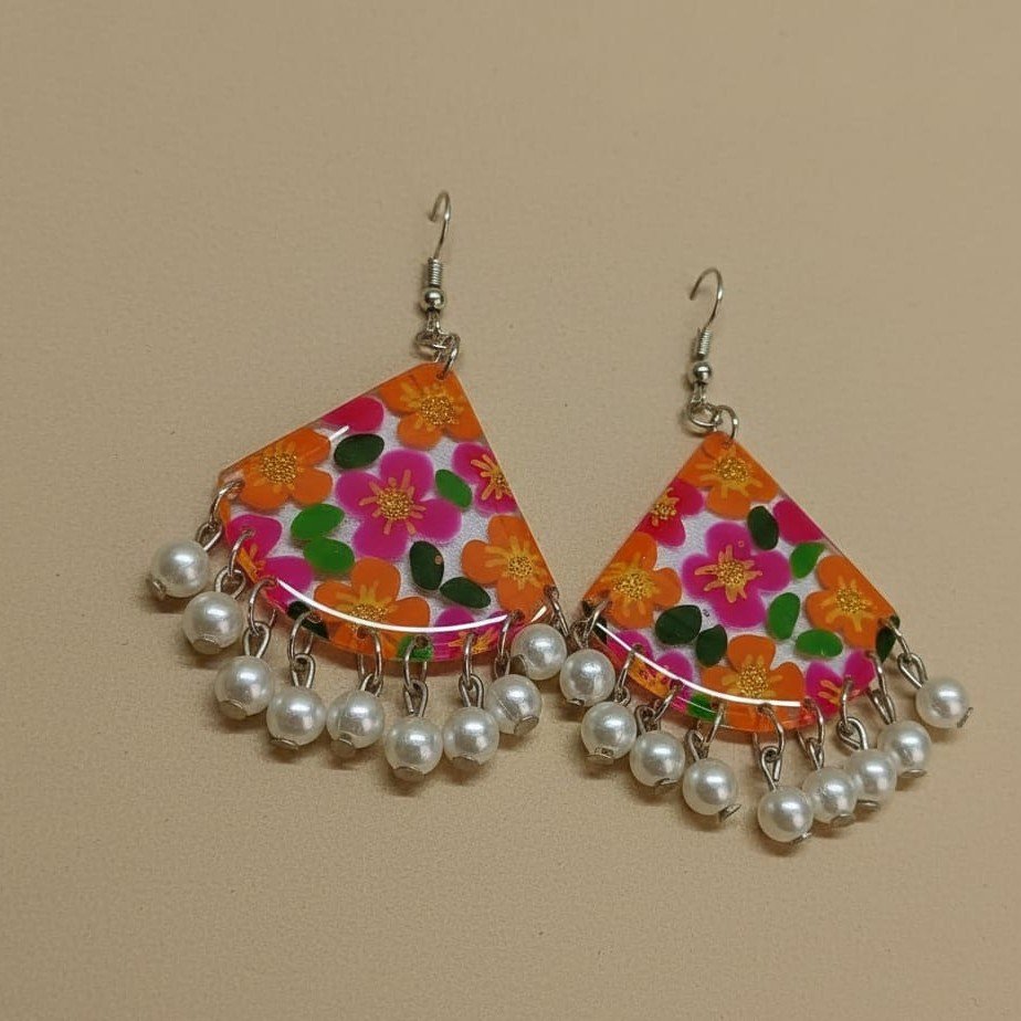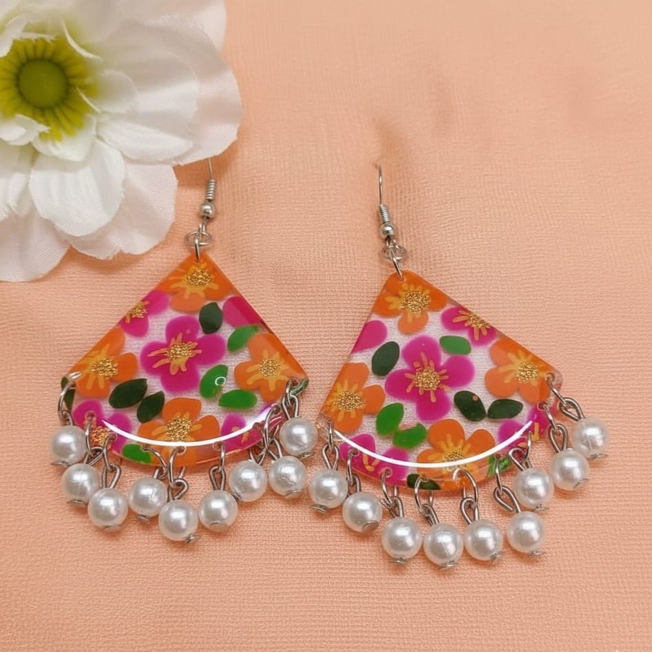 - PRODUCT DETAILS: Enhance your accessory collection with these handmade floral dangle earrings. Designed in a bold triangular shape, they feature a vibrant floral print in orange, pink, and green, paired with delicate faux pearl drops for an elegant finish. Lightweight and comfortable, these earrings combine modern boho charm with ethnic elegance, making them perfect for everyday wear, festive occasions, or gifting.