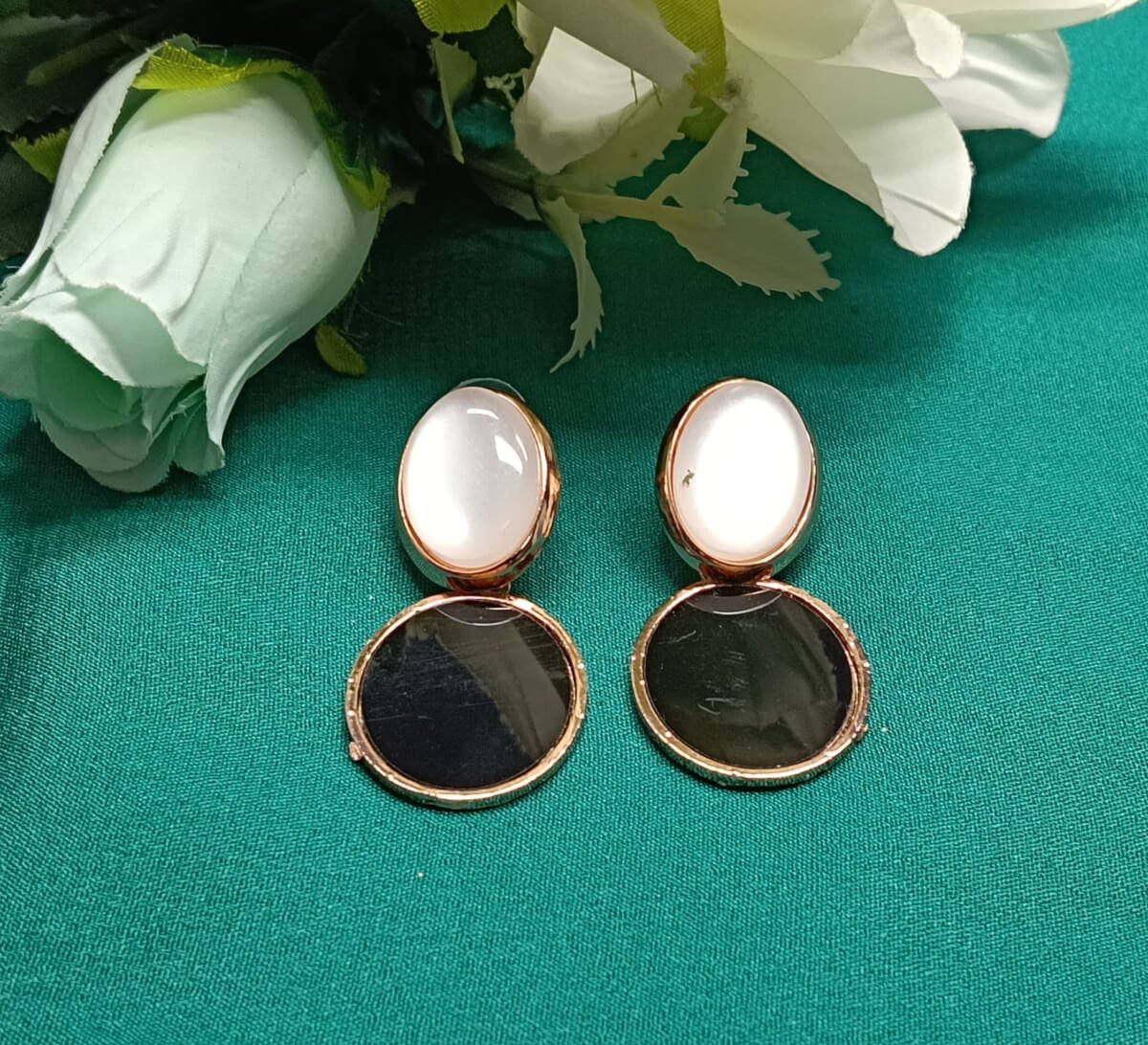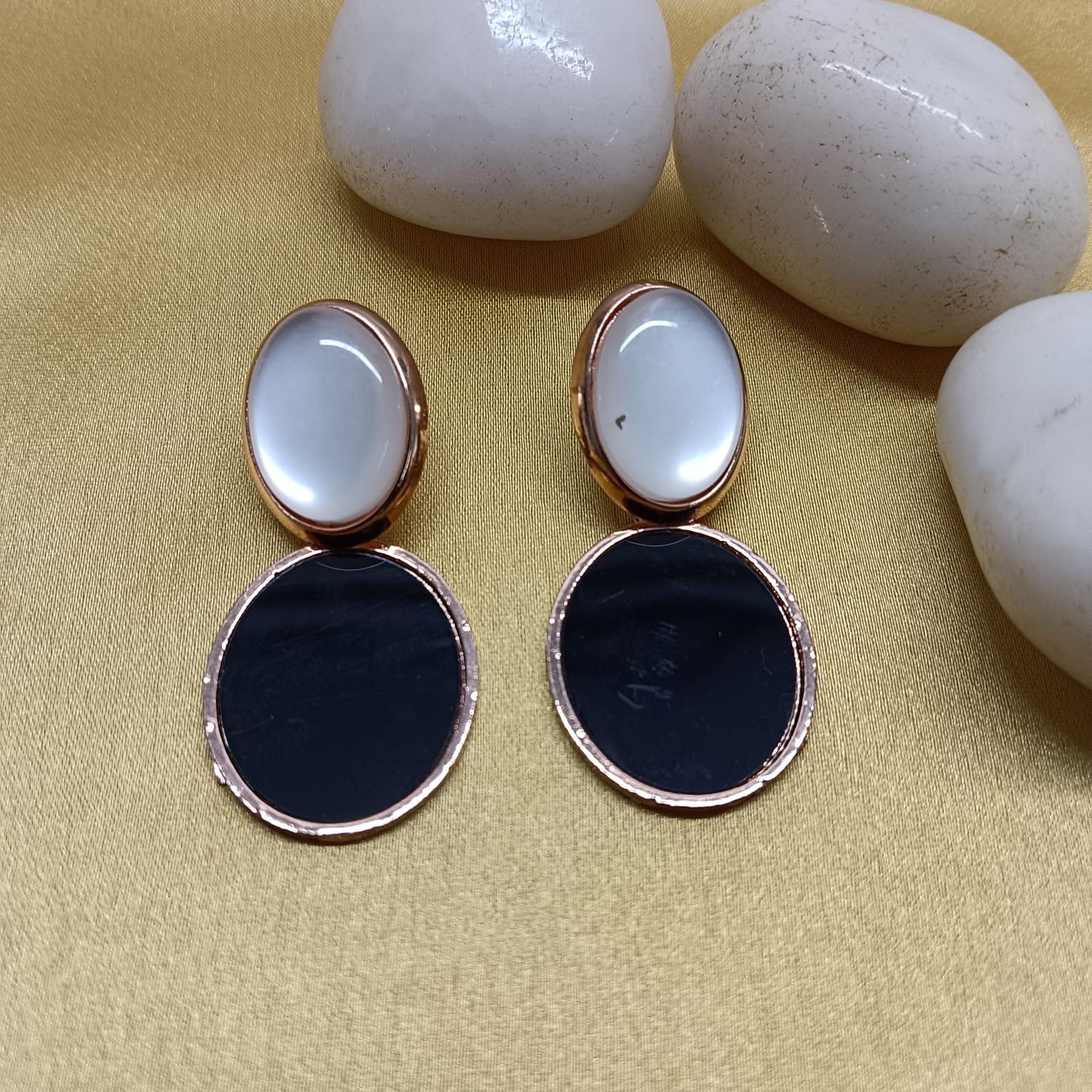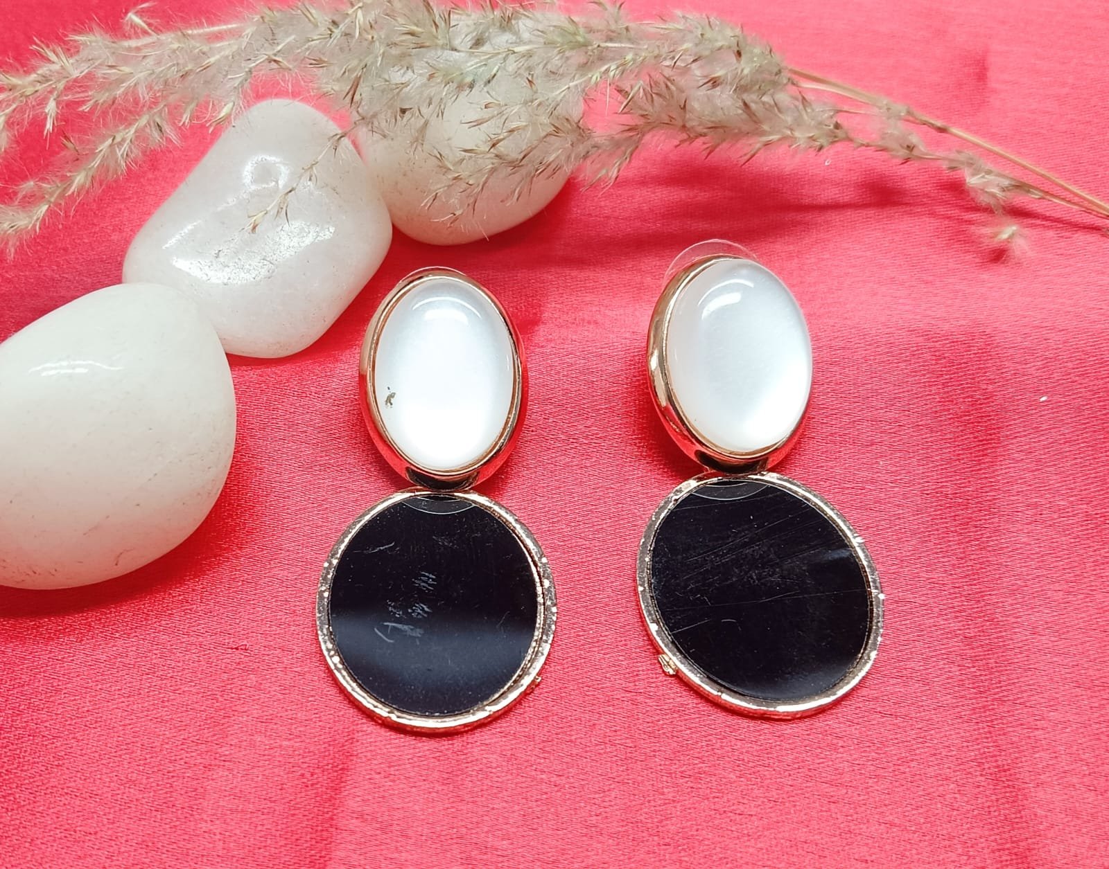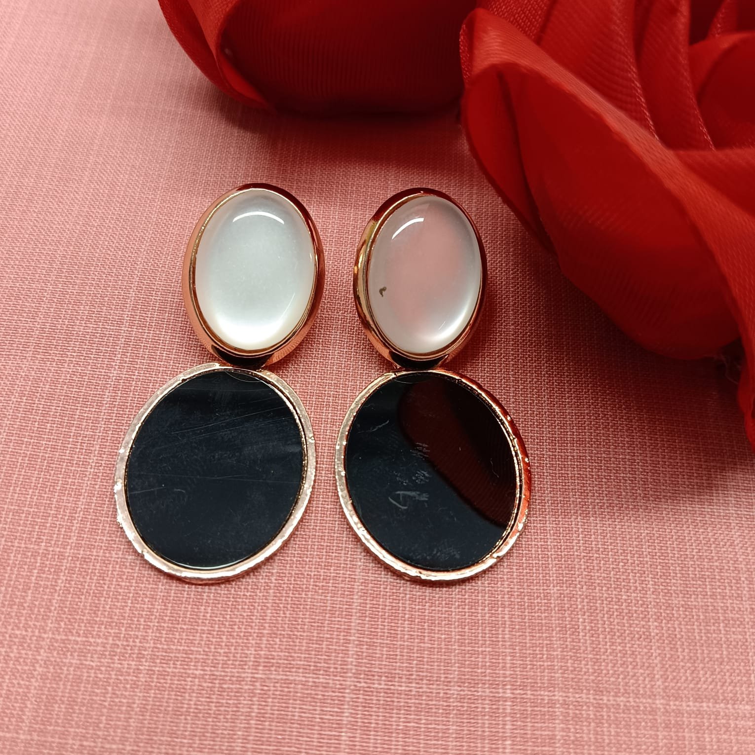 - PRODUCT DETAILS: Striking in form and contrast, these two-part earrings offer a contemporary take on classic design. The upper portion features a smooth, oval shape with a luminous pearlescent finish that subtly catches the light. Attached below is a larger, dark-toned oval base with a textured surface, creating depth and visual intrigue. The layered silhouette gives the impression of movement and dimension, while the interplay of light and dark tones adds a sophisticated edge. Crafted from lightweight resin, these earrings are as comfortable as they are stylish—perfect for both daywear and evening outings.