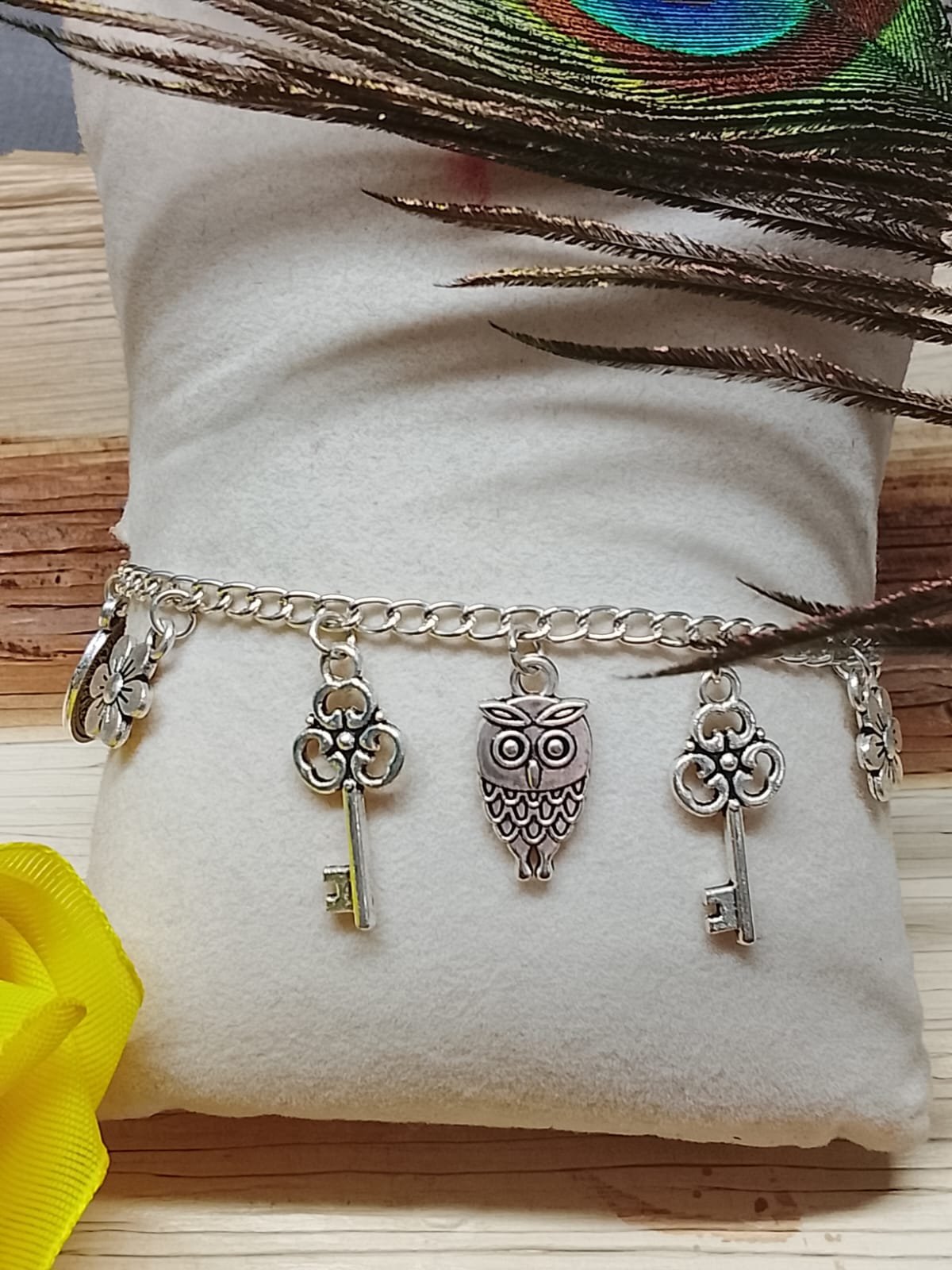 - PRODUCT DETAILS: This vintage-style silver-toned charm bracelet features an intricate chain adorned with a curated mix of iconic charms—an owl, skeleton keys, floral motifs, and classic coin-inspired designs. Each charm brings symbolic depth and personality, from the protective wisdom of the owl to the mystery and heritage of vintage keys and coins. The bracelet fastens with a lobster claw clasp for secure, easy wear. Perfect for everyday styling or as a thoughtful gift, it combines timeless elegance with personal meaning.