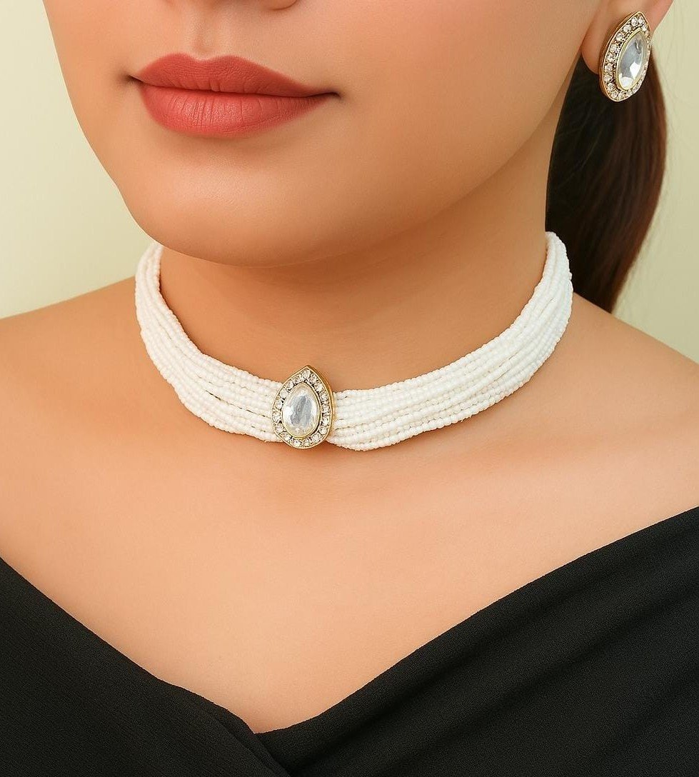 - PRODUCT DETAILS: Upgrade your accessory game with this stunning choker necklace and earring set, designed to add timeless elegance to any outfit. Featuring multiple strands of small white beads, this statement choker is beautifully accented with a clear, round centerpiece that draws attention to your neckline. The matching teardrop earrings mirror the same refined charm, making this set ideal for brides, bridesmaids, or anyone attending a wedding, prom, or formal party. Crafted with a gold-tone hook and eye clasp and durable settings, this set combines luxury style with comfort. The delicate yet sturdy design ensures long-lasting wear, while the versatile color scheme pairs effortlessly with a wide range of dresses and gowns.