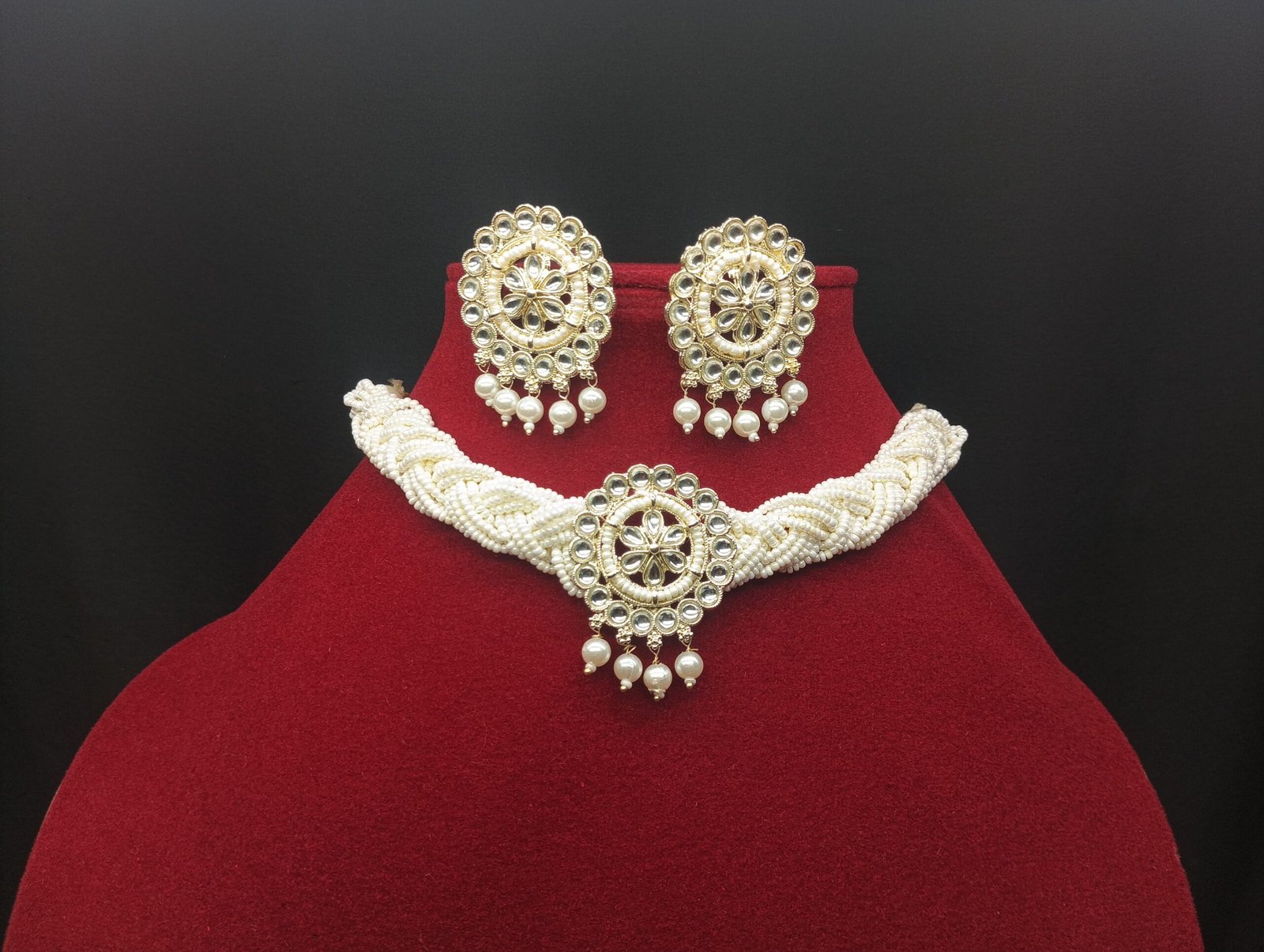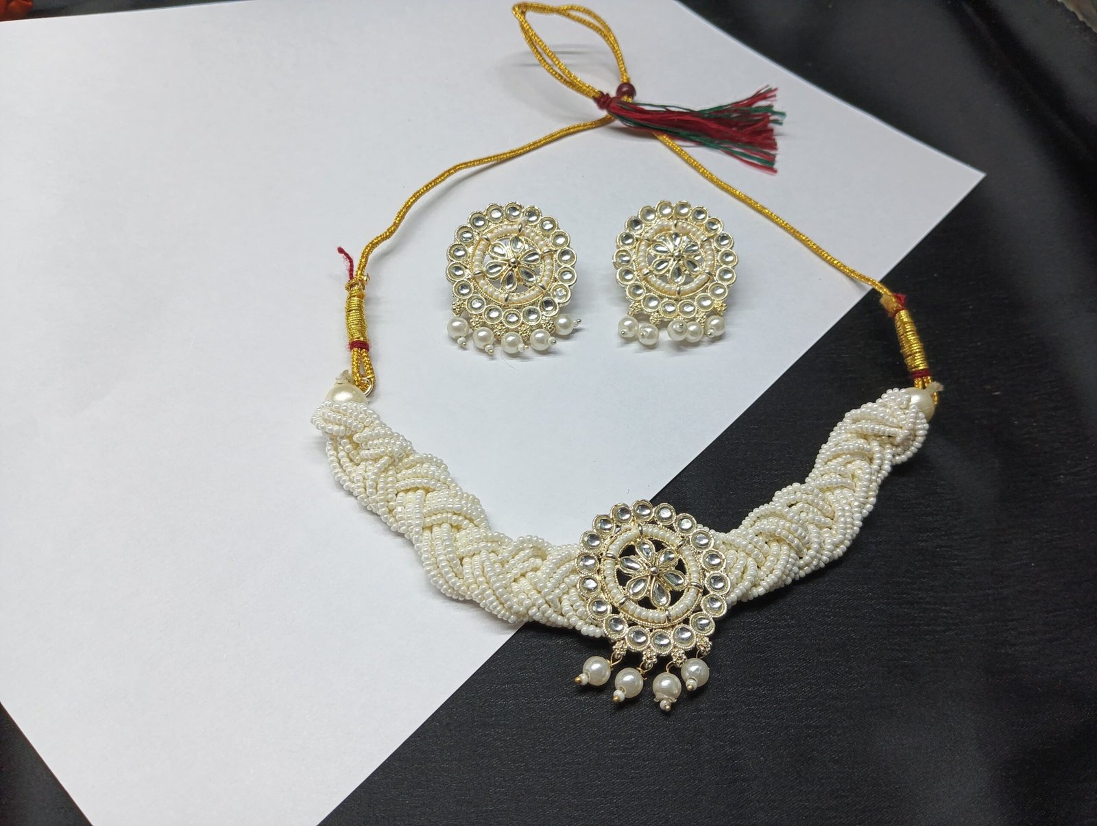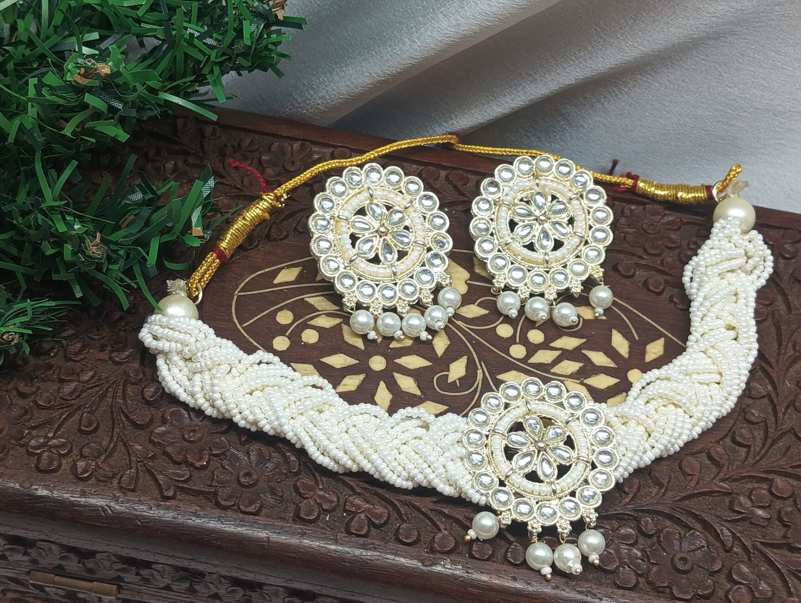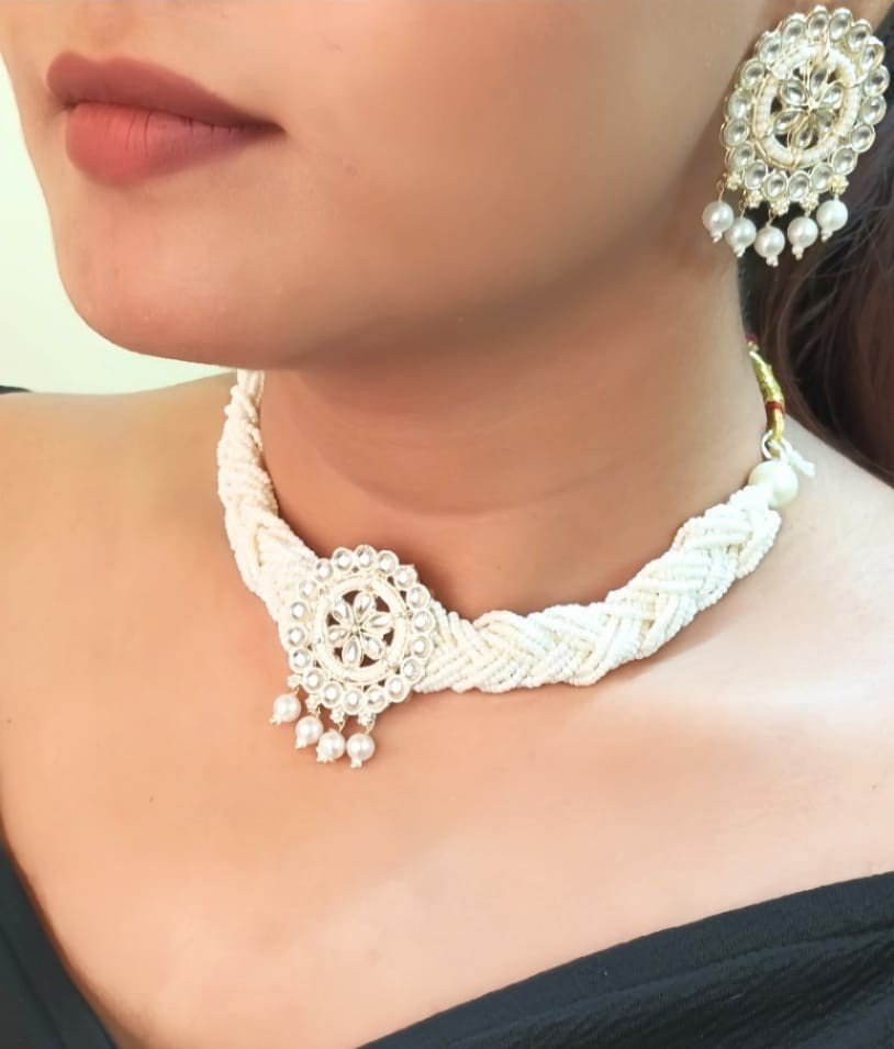 White beaded Necklace set with Earrings for Women| Braided Choker Necklace| Jewelry for Wedding, festive, and cultural events