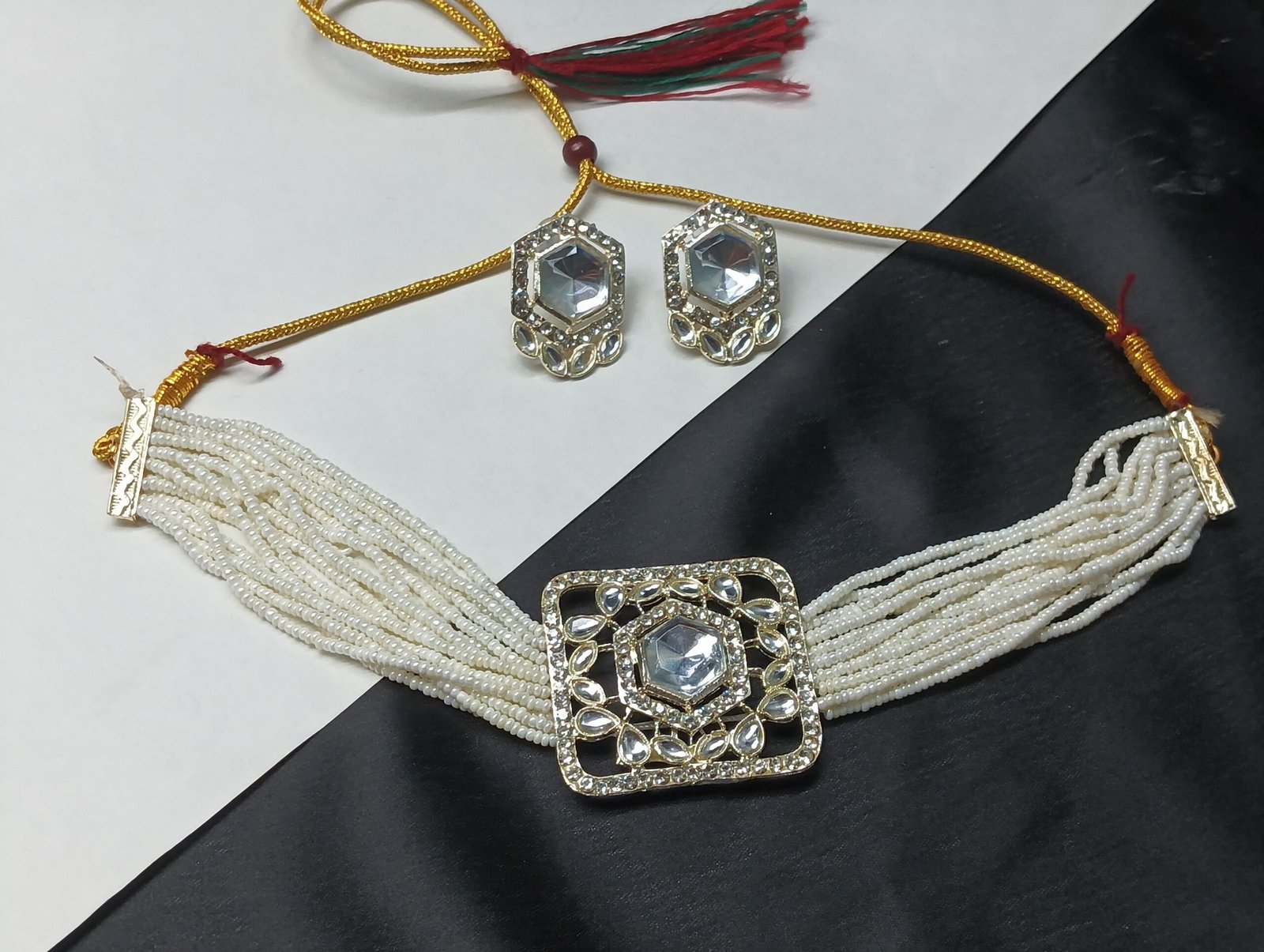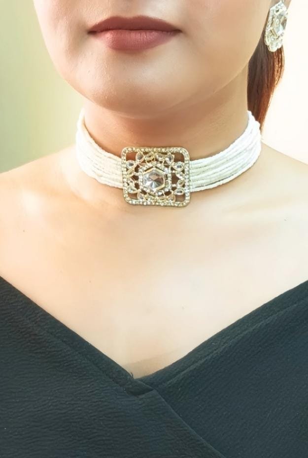 - PRODUCT DETAILS: This choker necklace and earring set is crafted to bring elegance to both traditional and contemporary looks. The necklace features multiple strands of small white beads, centered around a square-shaped ornament with a large, clear stone. The decorative border around the centerpiece adds visual appeal and refinement. The matching earrings complement the necklace with clear hexagonal stones framed in a similarly ornate design, creating a balanced and stylish set. The necklace is secured with a traditional adjustable thread closure, finished with a wooden ball, allowing for a customizable and comfortable fit. Ideal for weddings, festive occasions, and casual gatherings, this jewelry set adds charm to any outfit.