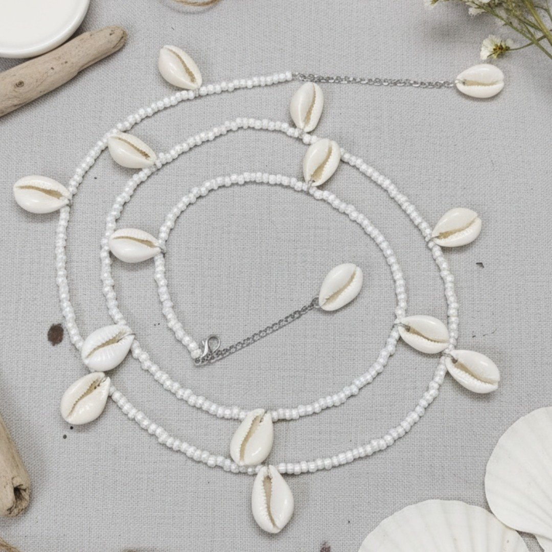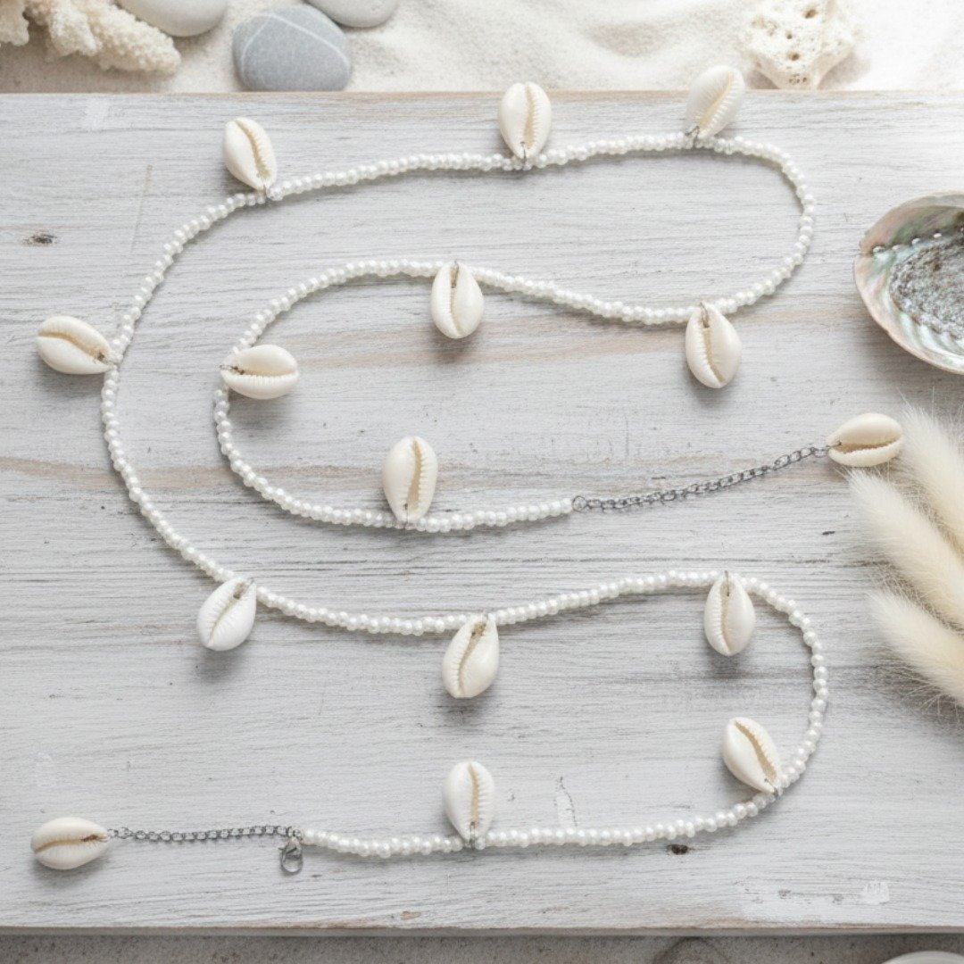 - PRODUCT DETAILS: This White Cowrie Shell Waist Chain features natural cowrie shells strung alongside small, round white beads, creating a flowy and naturally aesthetic accessory. Cowrie shells have held cultural, economic, and ornamental significance in various cultures. The cowrie was the shell most widely used worldwide as shell money. In addition to their historical significance, cowrie shells are associated with wealth, fertility, and protection in various cultures. This versatile waist chain offers a touch of bohemian charm, making it a perfect addition to beachwear or a subtle statement piece for everyday elegance. It effortlessly enhances various styles while carrying rich historical and spiritual meaning.