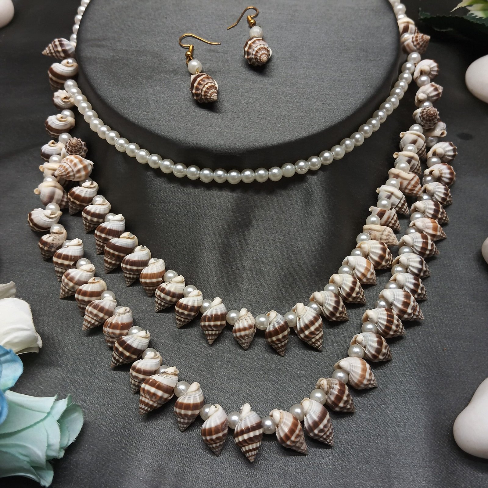 - PRODUCT DETAILS: Handcrafted jewelry set featuring a tiered, multi-strand necklace and matching drop earrings. The necklace layers genuine seashells—each uniquely patterned in earthy browns and creams—with luminous white pearls for a balanced blend of natural texture and sophisticated shine. Earrings mirror the necklace with a single shell drop paired with a pearl, creating cohesive coastal-inspired elegance. Made from handcrafted natural seashells and shell pearls, this set transitions effortlessly from casual daytime wear to refined evening looks.